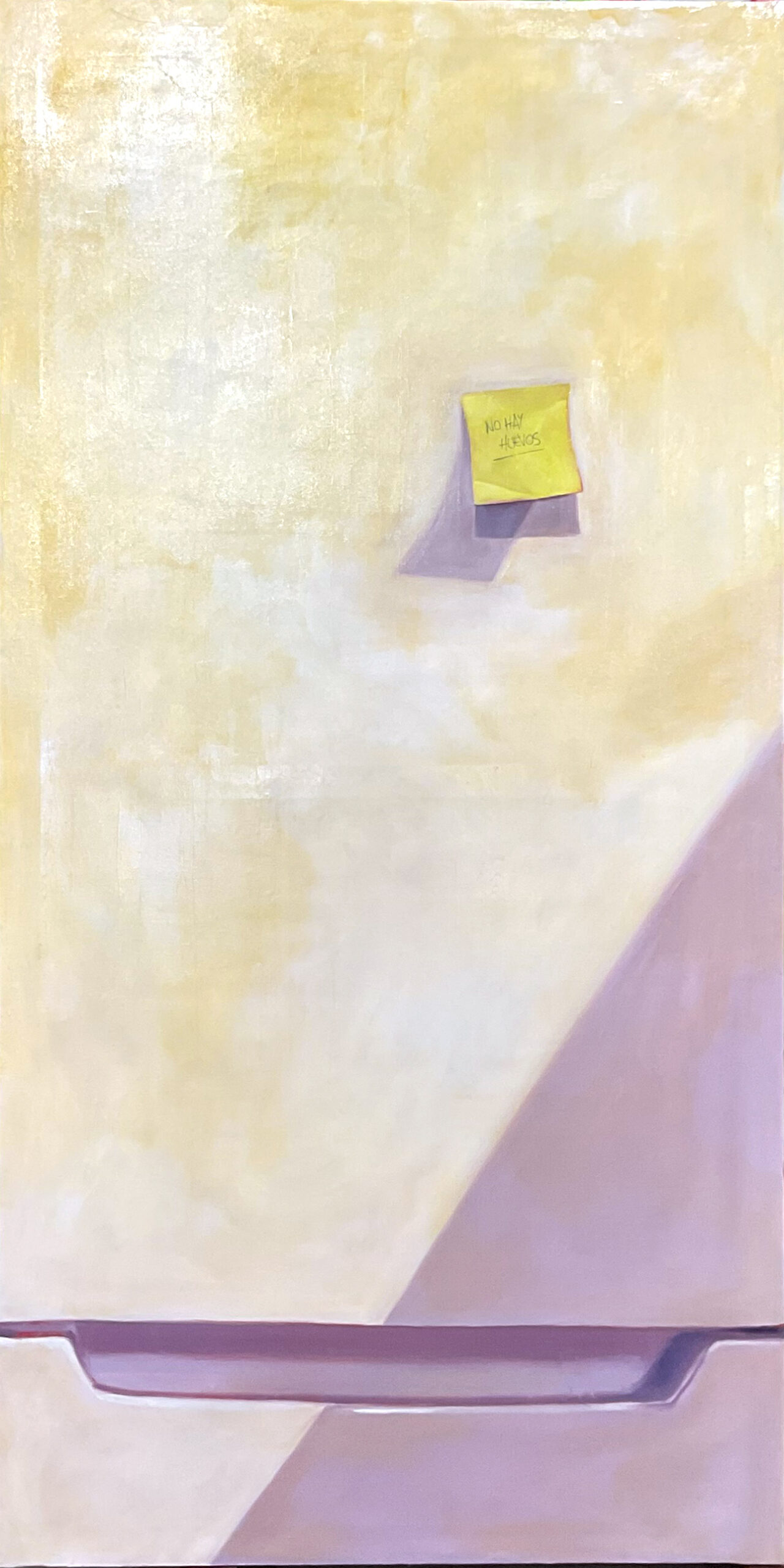 La frase «no hay huevos» actúa como un juego de palabras con una doble connotación, por un lado, es un recordatorio doméstico, una nota típica que cualquiera podría dejar en la cocina. Por otro lado, la expresión «no hay huevos» se utiliza coloquialmente para desafiar la valentía o el coraje, una expresión que históricamente se ha utilizado para cuestionar la masculinidad.